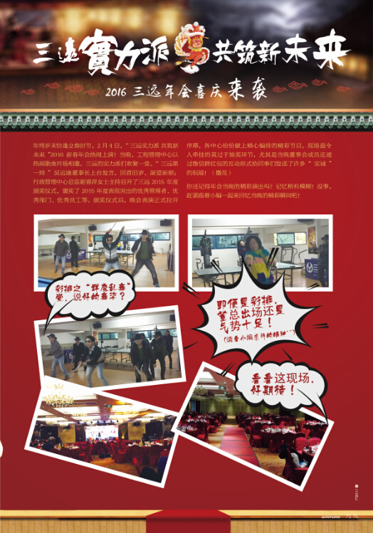 年終歲末恰逢立春時節,2月4日,“三遠實力派 共筑新未來”2016新春年會熱鬧上演!當晚,工程管理中心以熱鬧歌曲開場相邀,三遠的實力派們歡聚一堂。“三遠第一帥”吳遠康董事長上臺發言,回首舊歲,展望新朝;行政管理中心總監謝喜萍女士主持召開了三遠2015年度頒獎儀式,褒獎了2015年度表現突出的優秀管理者、優秀部門、優秀員工等。頒獎儀式后,晚會表演正式拉開序幕,各中心紛紛獻上精心編排的精彩節目,現場最令人牽掛的莫過于抽獎環節,尤其是當晚董事會成員還通過微信群紅包的互動形式給同事們發送了許多“實誠”的祝福!(撒花)