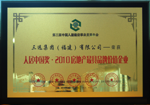 原建設部副部長、國家土地管理局局長、中國土地學會理事長鄒玉川同志,全國工商聯原副主席、中國房地產學會會長王治國同志,住建部住房政策專家委員會副主任、中國房地產及住宅研究會副會長顧云昌同志,等領導專家出席了本屆年會。來自全國各地的房地產、建筑﹑裝飾﹑物業管理等行業的企業家,代表共近200余位代表進行了交流與探討。會議期間舉行了隆重的頒獎典禮,公布了“人居中國獎” ﹑“金鼎獎”,評選獲獎企業和個人。經過各位專家學者各位評審老師針對房地產企業各項發展指標進行專業的評估后,最終授予三遠集團(福建)有限公司“人居中國獎·2010房地產最具品牌價值企業”榮譽稱號。